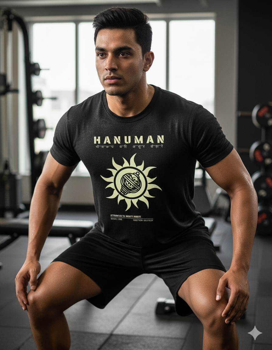 At its heart, this design celebrates Hanuman, the epitome of strength, wisdom, and selfless service. The striking imagery of his divine gada (mace), encircled by the radiant sun, is a timeless reminder of inner power and the light that guides through darkness. The Sanskrit inscription, "भीम रूप धरि असुर संहारे" (Assuming a gigantic form, he slayed the demons), subtly conveys a message of overcoming formidable challenges—a narrative that resonates deeply with the modern individual striving for personal excellence and resilience.